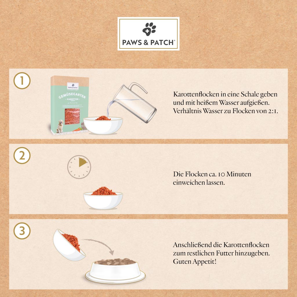 Die getrockneten und vorgegarten Karottenflocken von PAWS&PATCH sind eine ideale Beilage zu selbstgekochtem Futter, BARF-Rationen oder zur Schonkost. Die Karottenflocken finden auch als Ergänzung von Trocken- oder Nassfutter Anwendung. Die schonend dampfgegarten Karottenflocken sind eine glutenfreie Gemüsebeilage mit einer hohen Geschmacksakzeptanz bei Hunden.