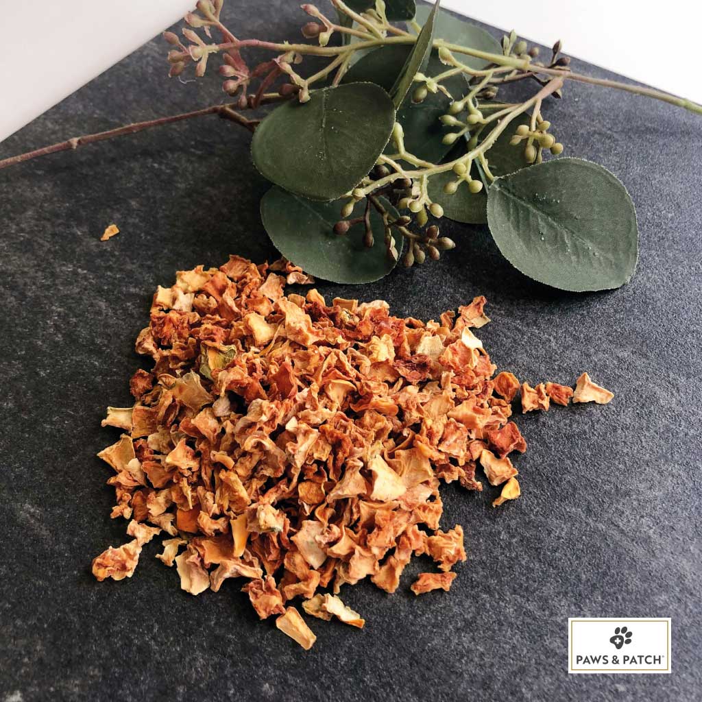 Die getrockneten Kürbisflocken von PAWS&PATCH sind eine ideale Beilage zu selbstgekochtem Futter, BARF-Rationen oder zur Schonkost. Die Kürbisflocken finden auch als Ergänzung von Trocken- oder Nassfutter Anwendung. Die schonend verarbeiteten Kürbisflocken sind eine glutenfreie Gemüsebeilage mit einer hohen Geschmacksakzeptanz.