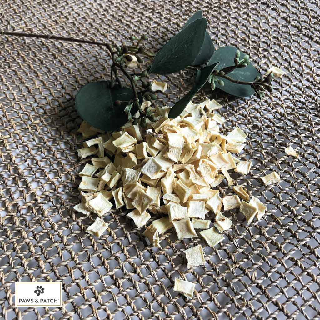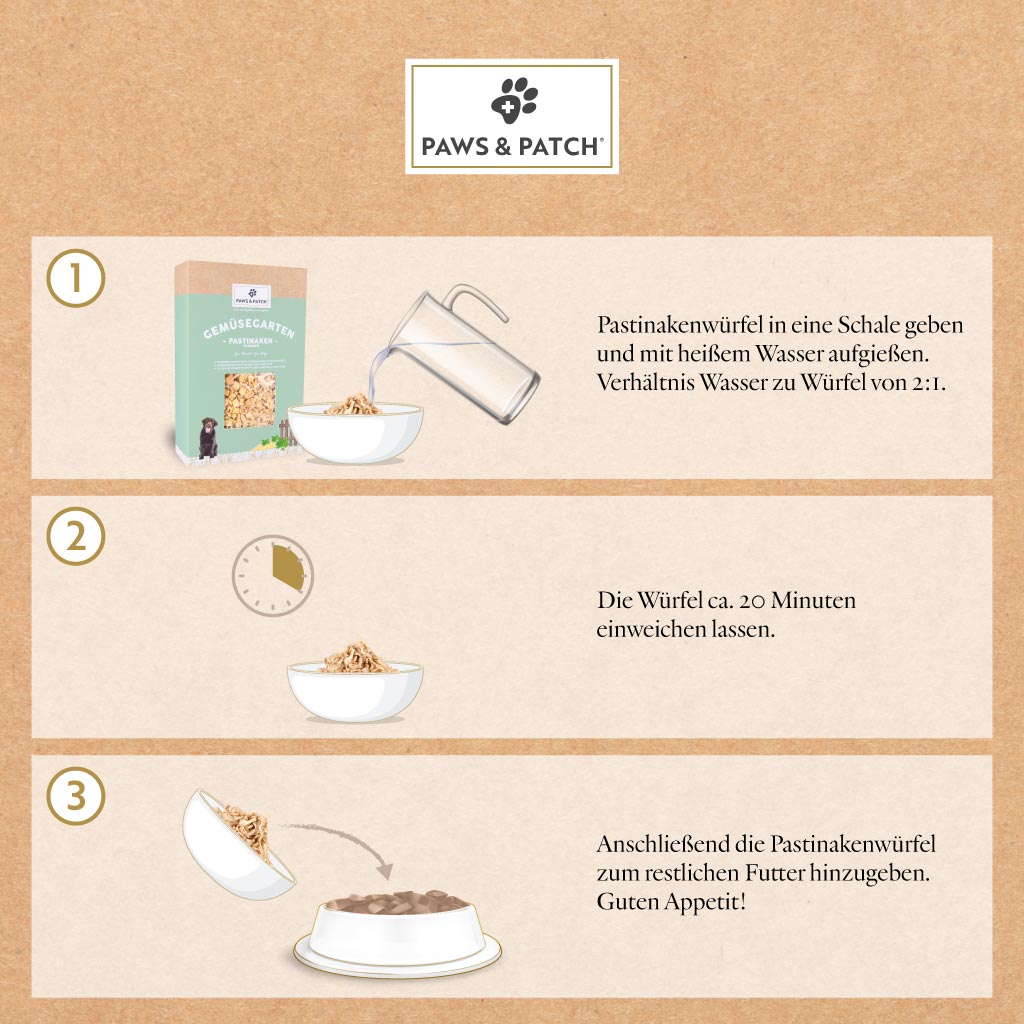Die getrockneten Pastinakenwürfel von PAWS&PATCH sind eine ideale Beilage zu selbstgekochtem Futter, BARF-Rationen oder zur Schonkost. Die Pastinakenwürfel finden auch als Ergänzung von Trocken- oder Nassfutter Anwendung. Die schonend verarbeiteten Pastinakenwürfel sind eine leicht verträgliche Gemüsebeilage und besitzen eine hohe Geschmacksakzeptanz bei Hunden.